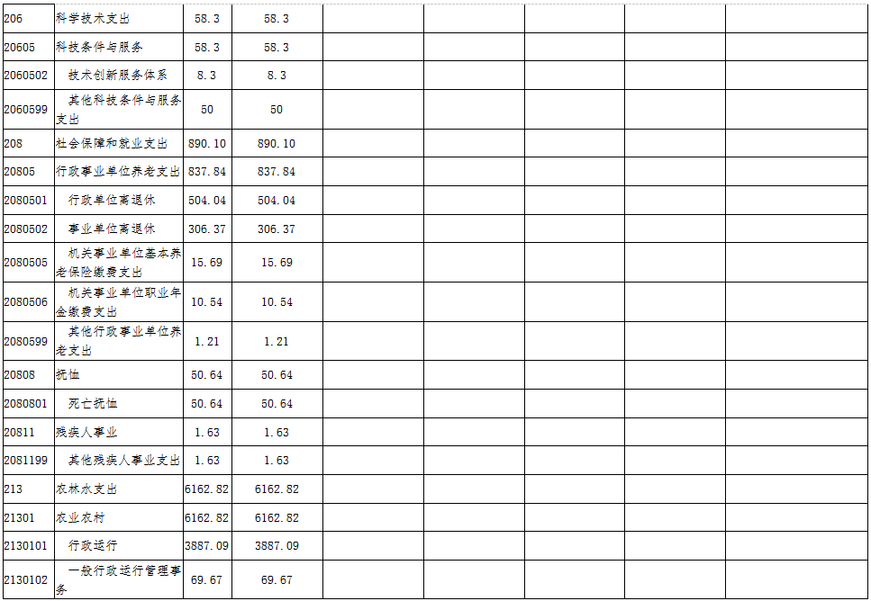 2021年度财政拨款支出8110.93万元,主要用于以下方面:一般公共服务(类)支出344.29万元,占4.24%;科学技术(类)支出59.18万元,占0.73%;社会保障和就业(类)890.1万元,占10.97%;节能环保(类)支出9.63万元,占0.12%;农林水(类)支出6520.54万元,占80.4%,住房保障(类)支出287.18万元,3.54%。