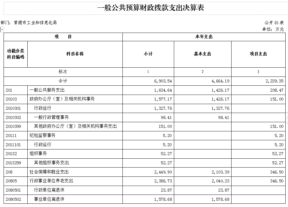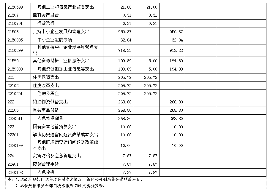 2021年度财政拨款支出6903.54万元,主要用于以下方面:一般公共服务(类)支出1634.64万元,占23.68%;社会保障和就业支出2449.90万元,占35.49%;节能环保支出204.23万元,占2.96%;农林水支出15.65万元,占0.23%;资源勘探信息等支出2116.73万元,占30.66%;住房保障支出205.72万元,占2.98%;粮油物资储备支出268.80万元,占3.89%;灾害防治及应急管理支出7.87万元,占0.11%。