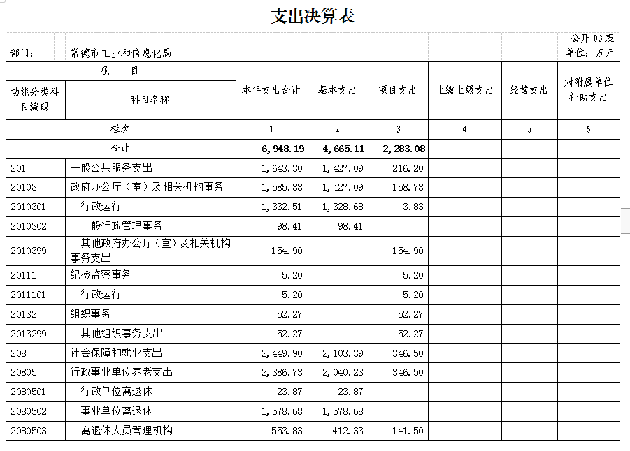 本年支出合计6948.19万元,其中:基本支出4665.11万元,占67.14%;项目支出2283.08万元,占32.86%;上缴上级支出0万元,占0%;经营支出0万元,占0%;对附属单位补助支出0万元,占0%。