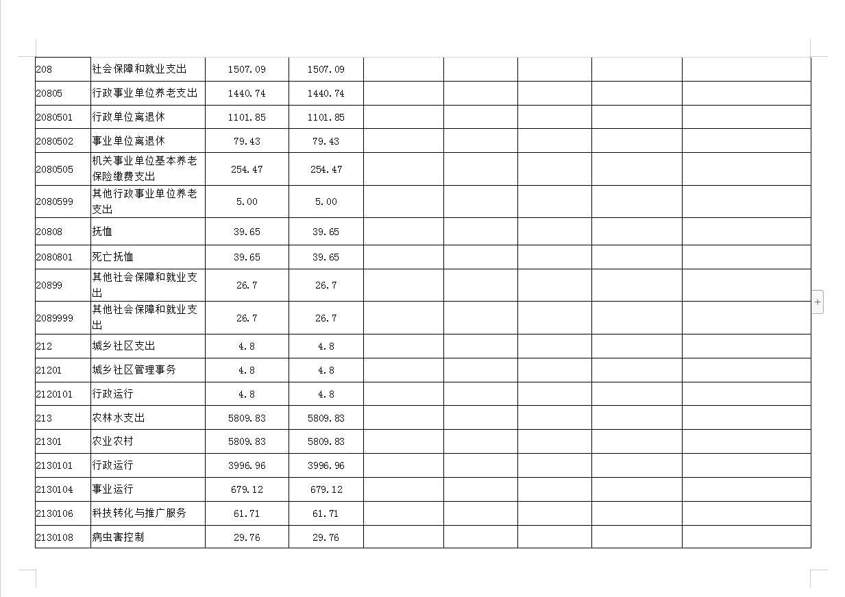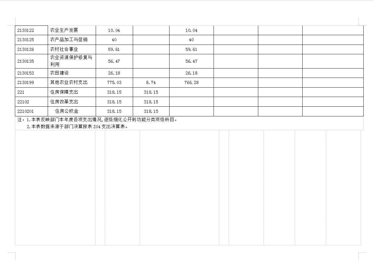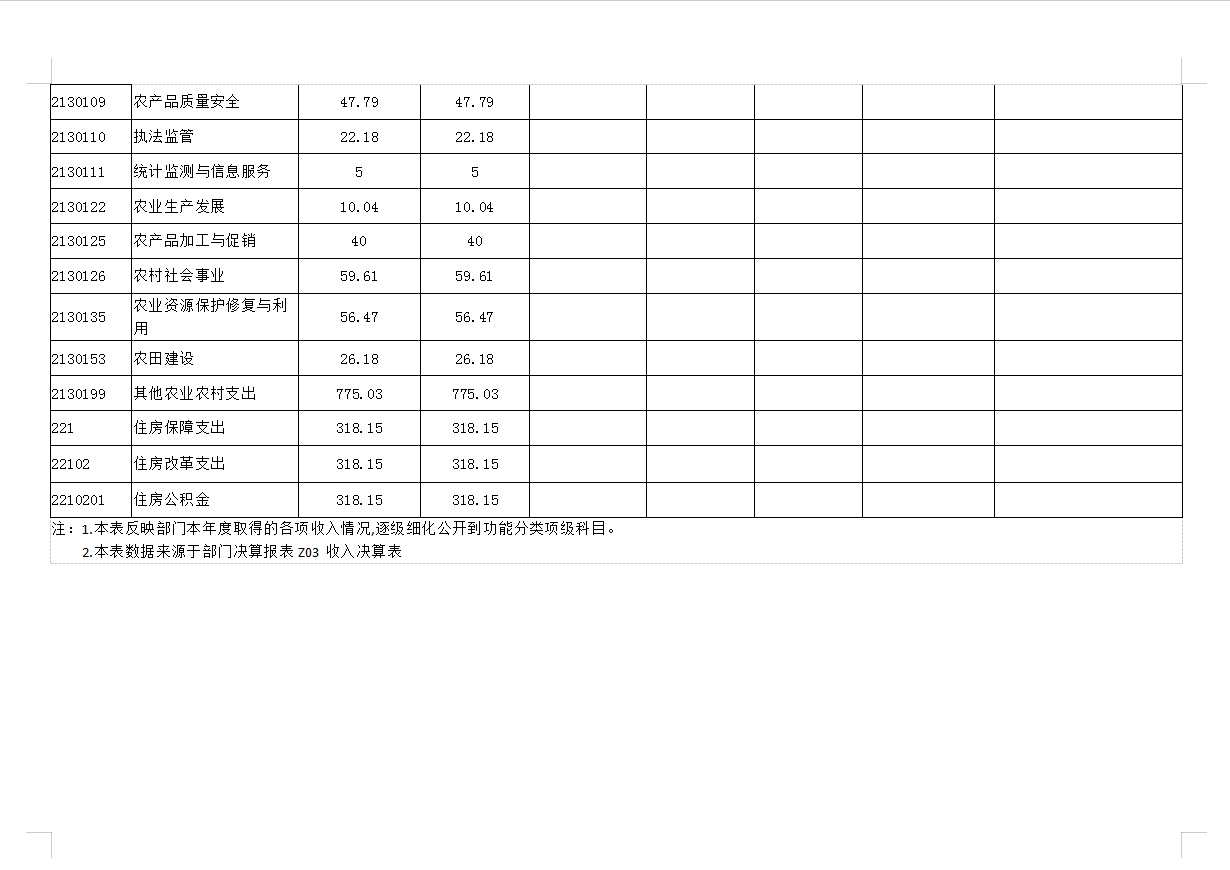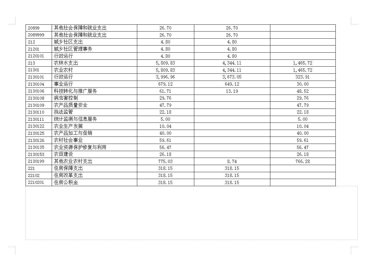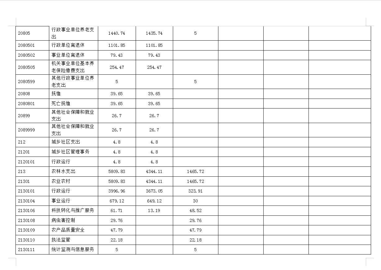 五、农林水支出:指为保持农业农村局正常运转及开展业务工作的各项支出,包括行政运行、事业运行、科技转化与推广、农产品质量安全、农田建设、执法监管、病虫害控制、农村社会事业、农业资源保护修复与利用等。