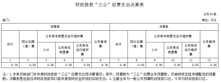 “三公”经费财政拨款支出预算为6.3万元,支出决算为0万元,完成预算的0%,其中: