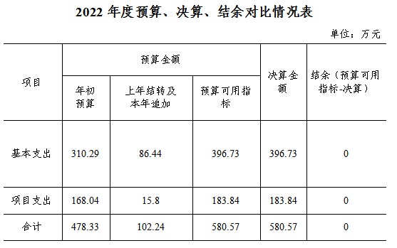2022年度财政拨款支出年初预算数为478.33万元,支出决算数为580.57万元,完成年初预算的121.37%,其中: