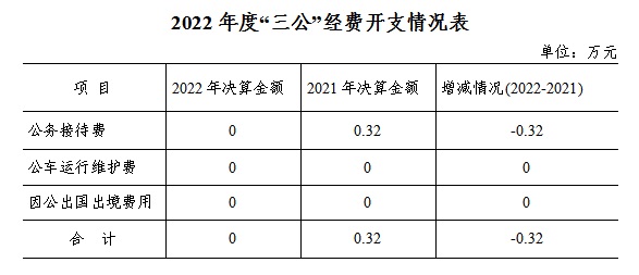 2022年度“三公”经费财政拨款支出决算中,公务接待费支出决算0万元,由于预算数为0,无法计算比例,因公出国(境)费支出决算0万元,由于预算数为0,无法计算比例,公务用车购置费及运行维护费支出决算0万元,由于预算数为0,无法计算比例。其中: