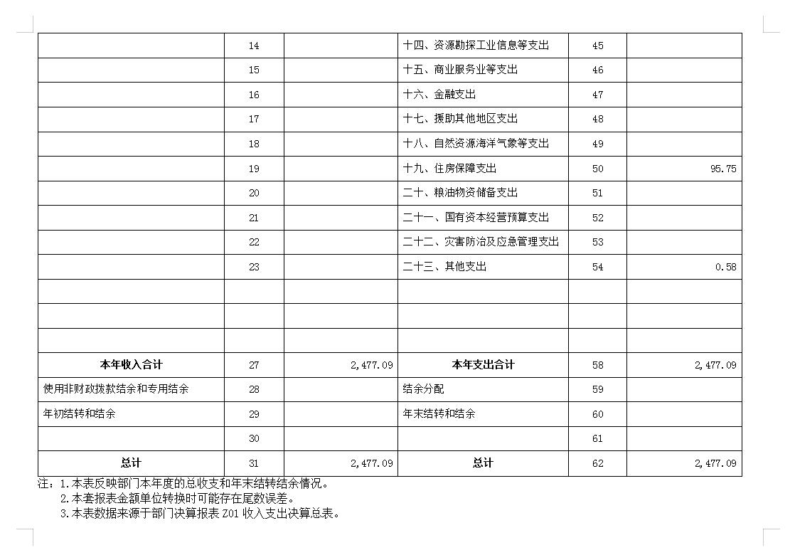 2023年度收入合计2477.09万元,其中:财政拨款收入2453.23万元,占99%;上级补助收入0万元,占0%;事业收入0万元,占0%;经营收入0万元,占0%;附属单位上缴收入0万元,占0%;其他收入23.86万元,占1%。