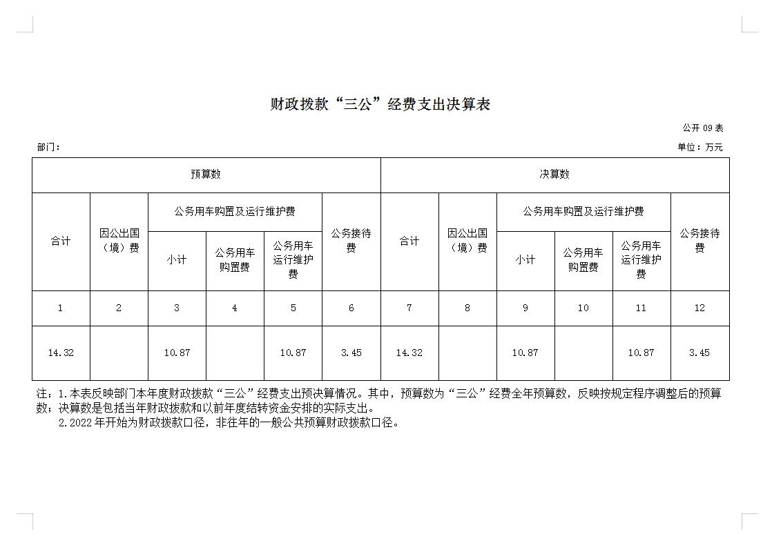“三公”经费财政拨款支出预算为14.32万元,支出决算为14.32万元,完成预算的100%,决算数等于预算数,与上年相比减少(增加)0万元,减少(增长)0%。其中: