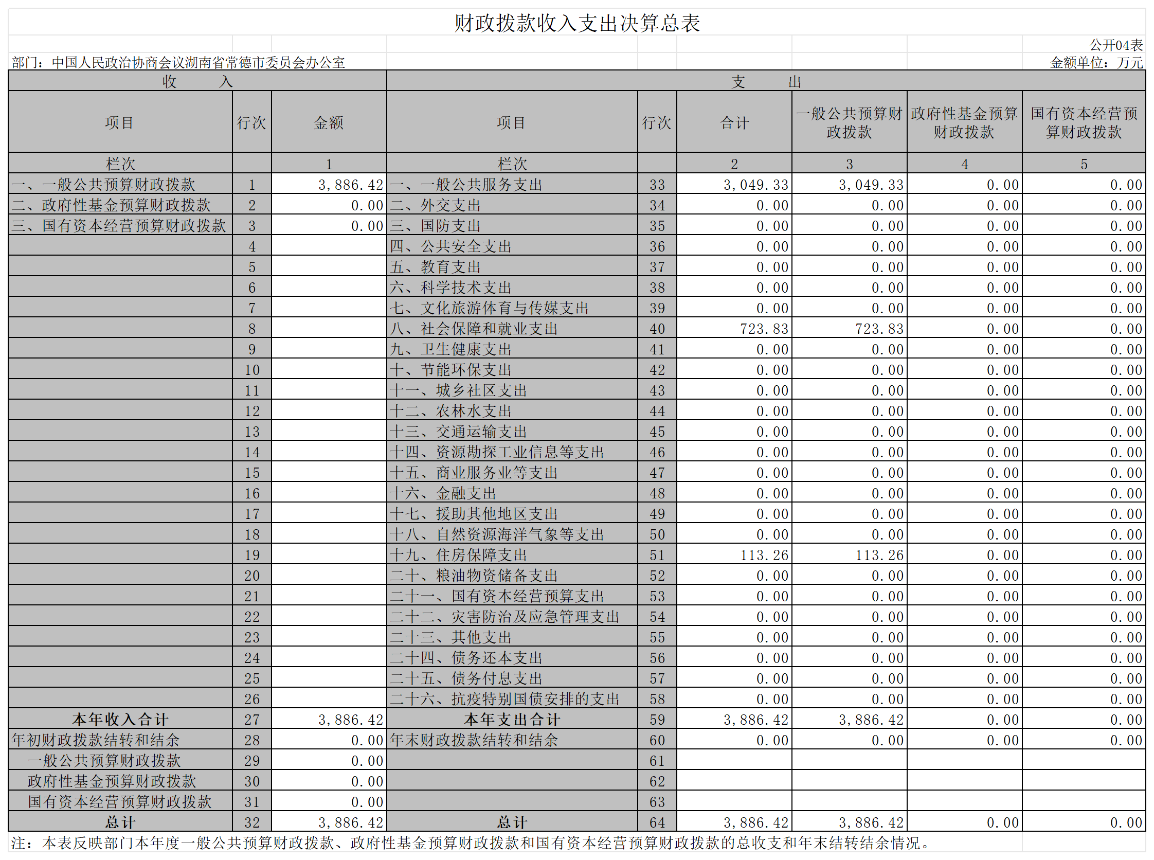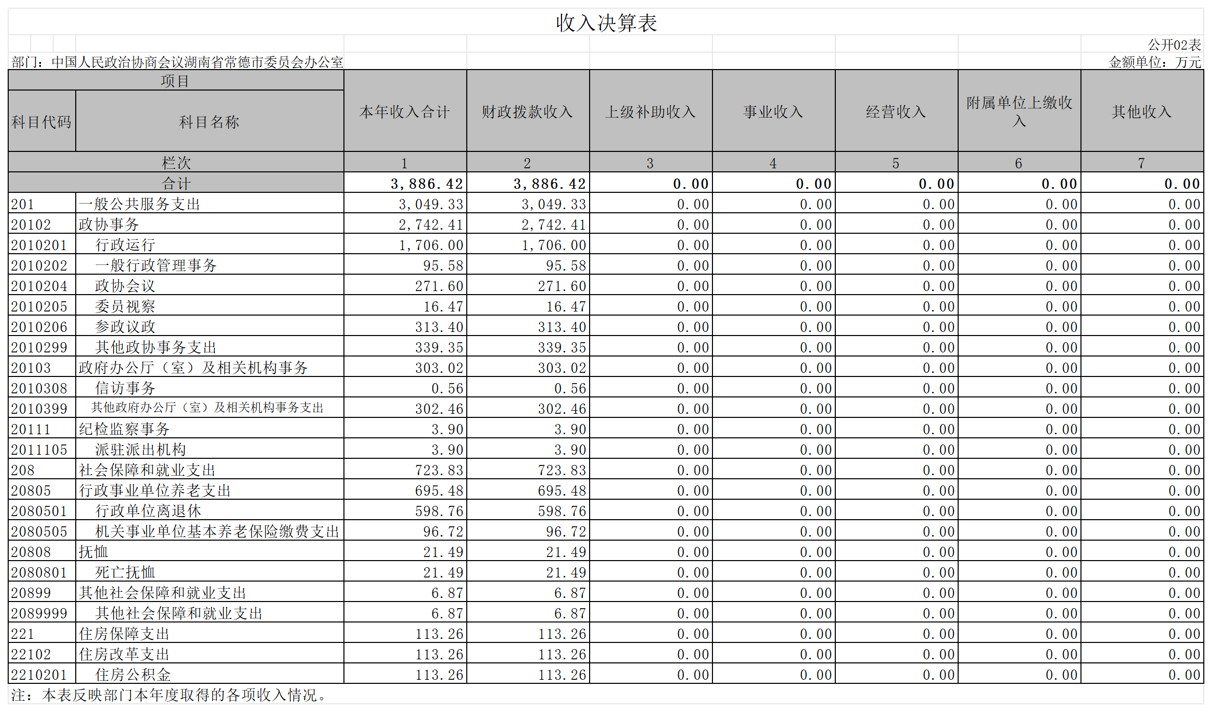 2022年度收入合计3886.42万元,其中:财政拨款收入3886.42万元,占100%;上级补助收入0万元,占0%;事业收入0万元,占0%;经营收入0万元,占0%;附属单位上缴收入0万元,占0%;其他收入0万元,占0%。