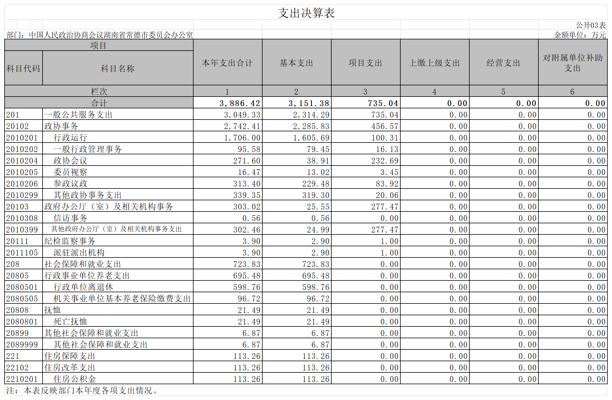 2022年度支出合计3886.42万元,其中:基本支出3151.38万元,占81%;项目支出735.04万元,占19%;上缴上级支出0万元,占0%;经营支出0万元,占0%;对附属单位补助支出0万元,占0%。