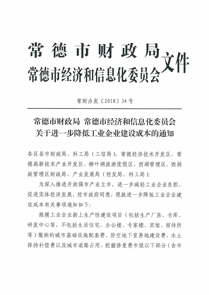 常德市财政局 常德市经济和信息化委员会关于进一步降低工业企业建设成本的通知