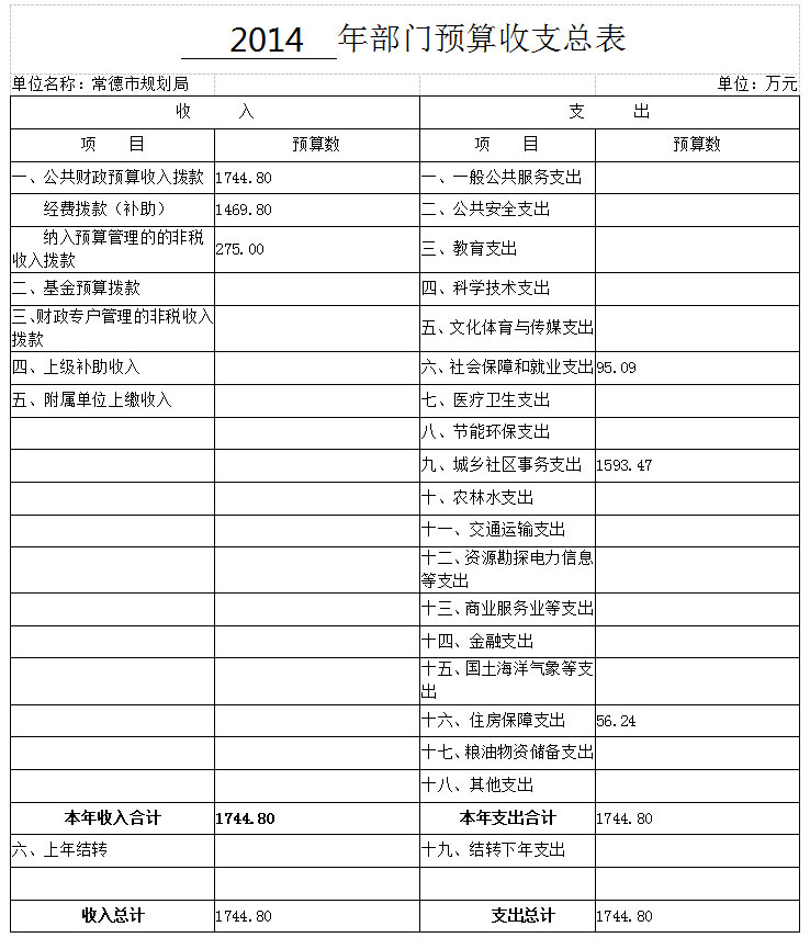 (二)支出预算,2014年年初预算数1744.80万元,其中:社会保障和就业95.09万元,城乡社区事务1593.47万元,住房保障56.24万元。