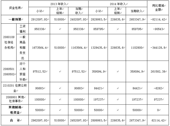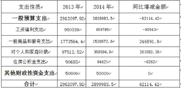 从上表可知:2014年一般预算支出比去年同期减少82114.42元,减少的原因见表一分析。