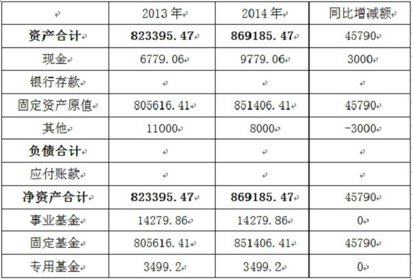 从上表可以看出:2014年资产合计比去年同期增加45790元,主要是固定资产比去年增加45790元。  四、“三公经费”情况说明  2014年“三公经费”621251元,比上年减少245840.54元。主要是公务接待费比上年减少了244832.4元,减少较大主要原因为上年消化历史欠账较今年多 。