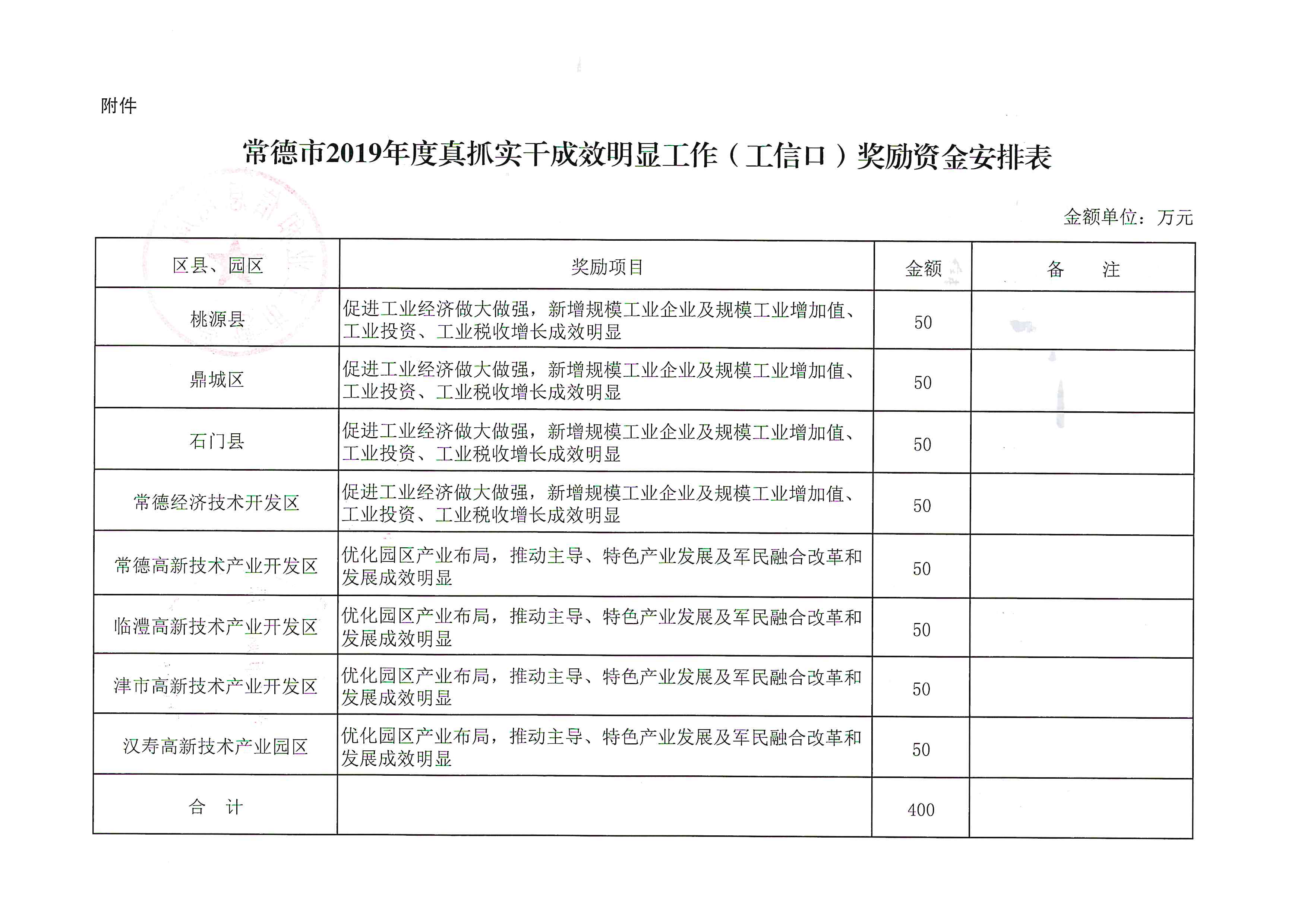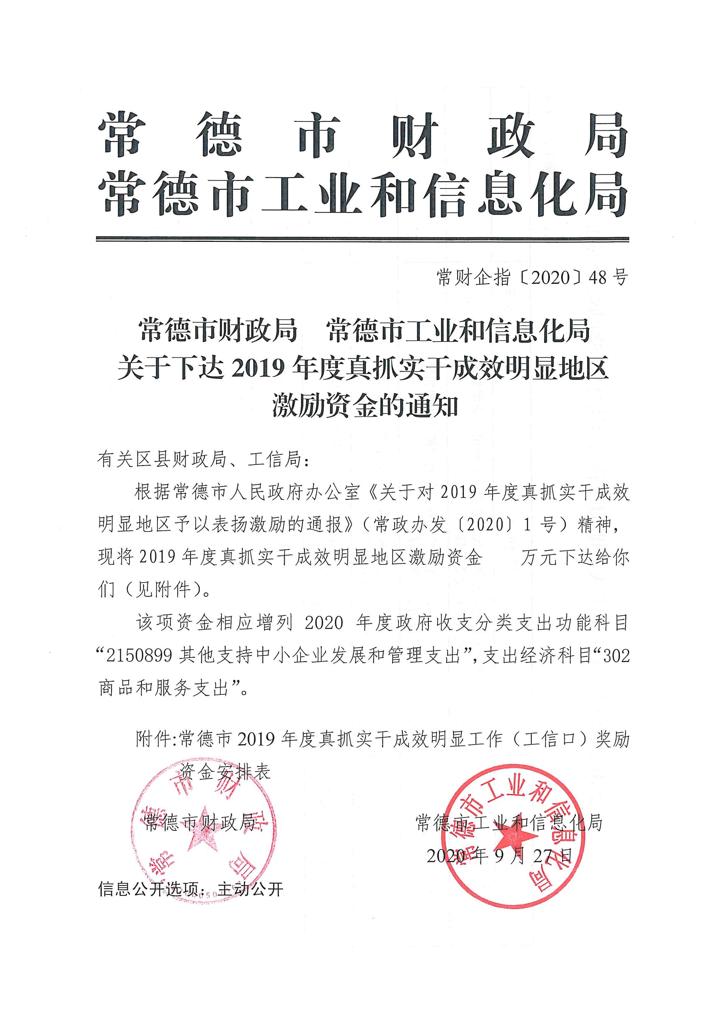 常德市财政局 常德市工业和信息化局关于下达2019年度真抓实干成效明显地区激励资金的通知