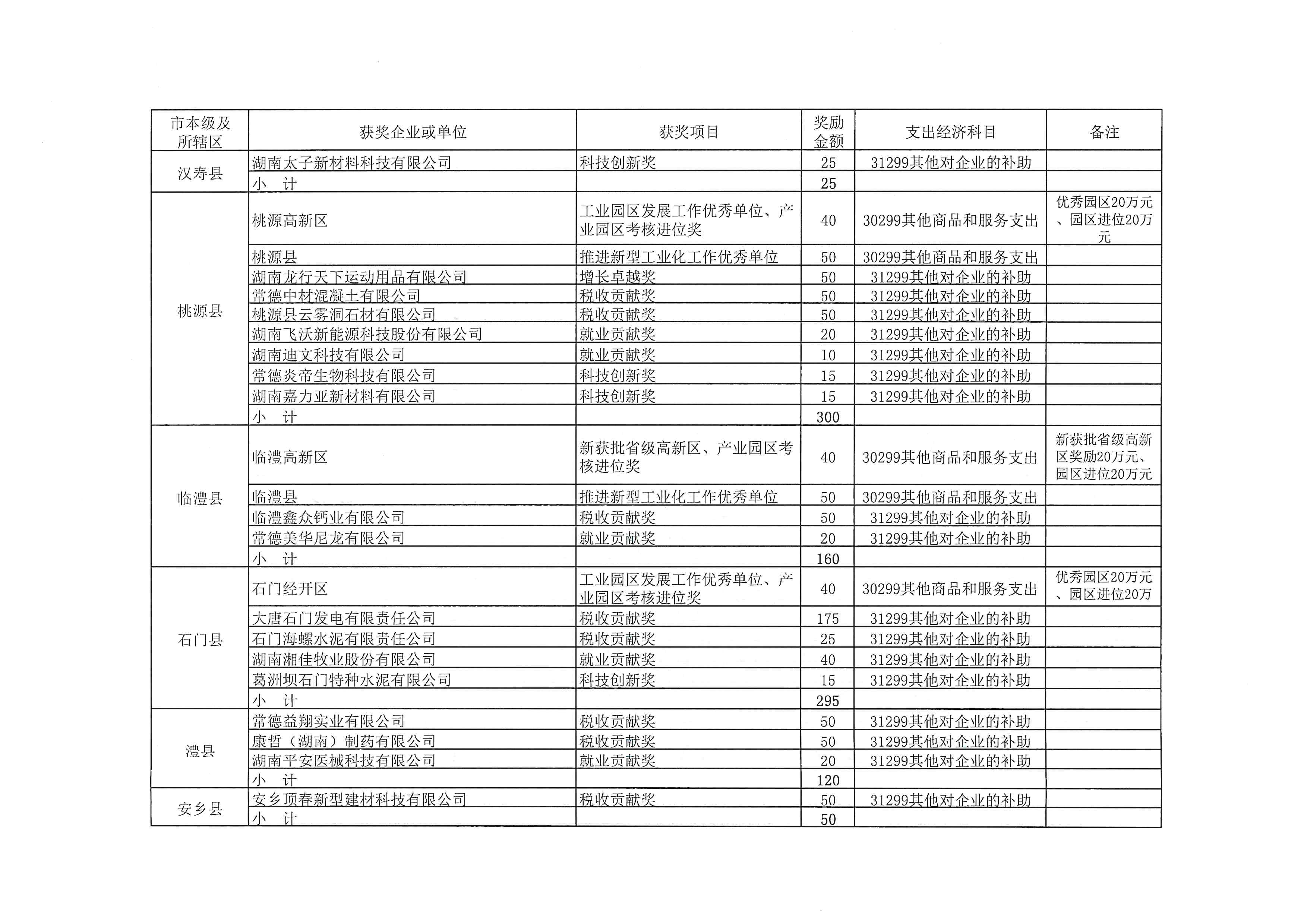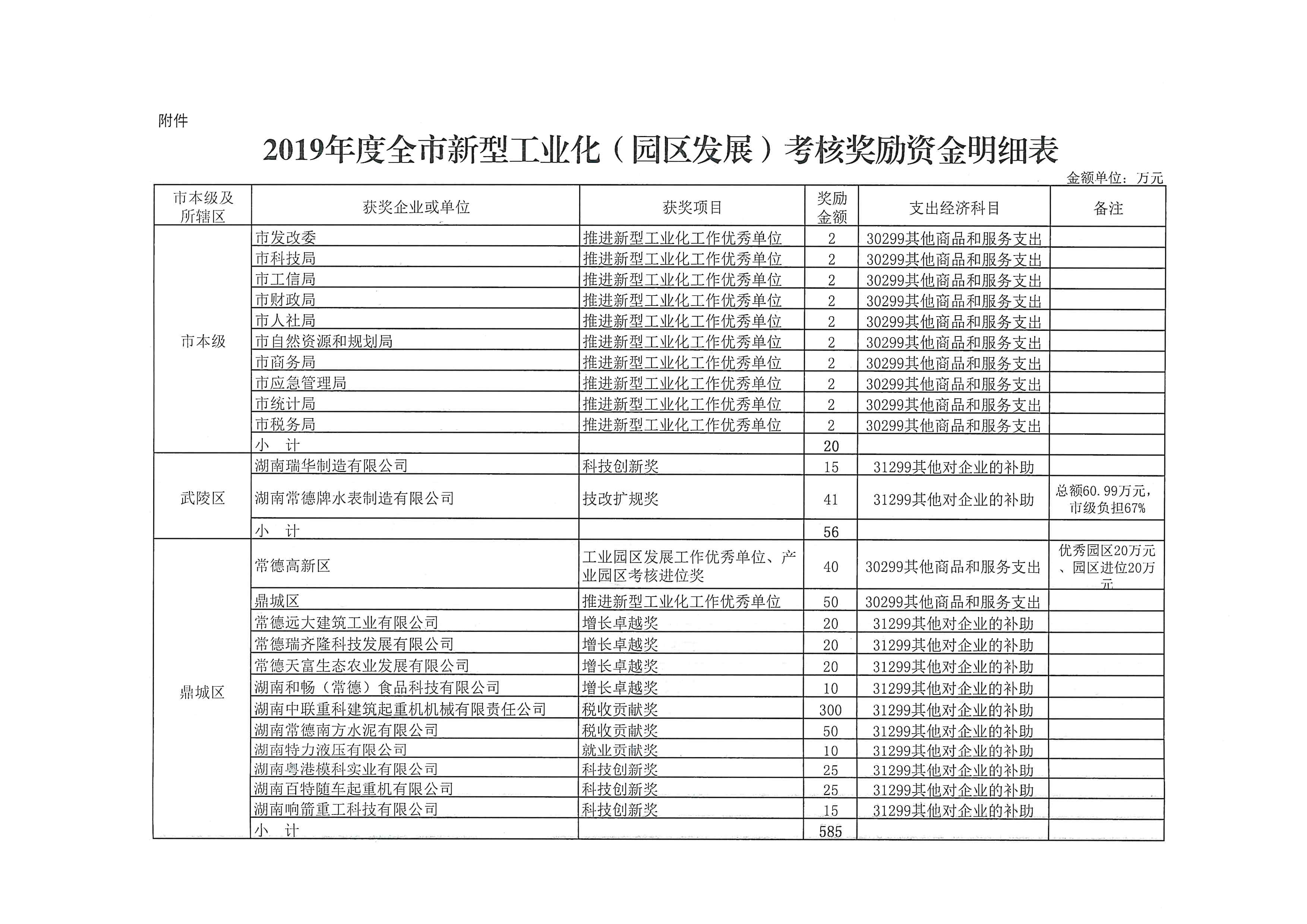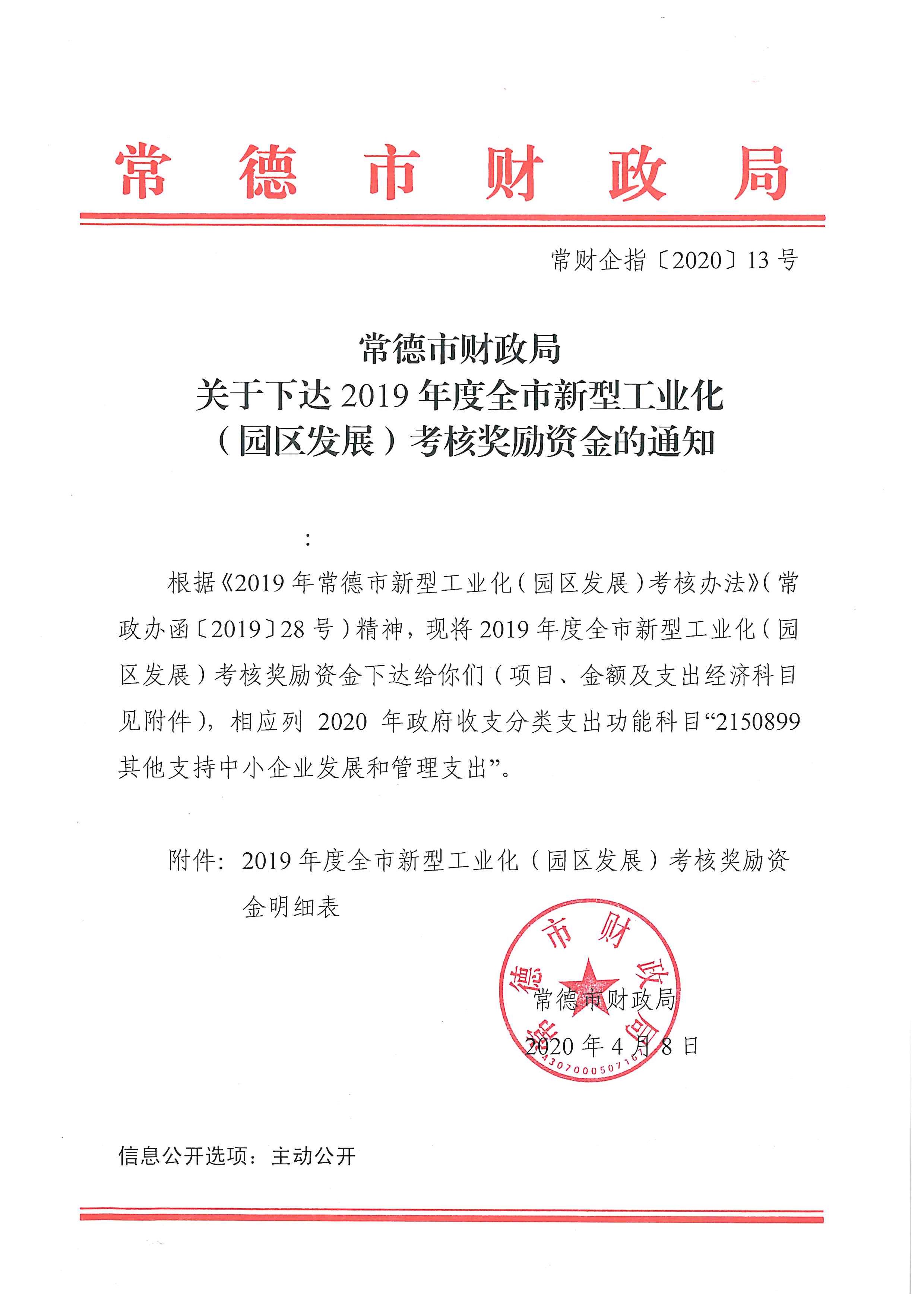 常德市财政局关于下达2019年度全市新型工业化(园区发展)考核奖励资金的通知