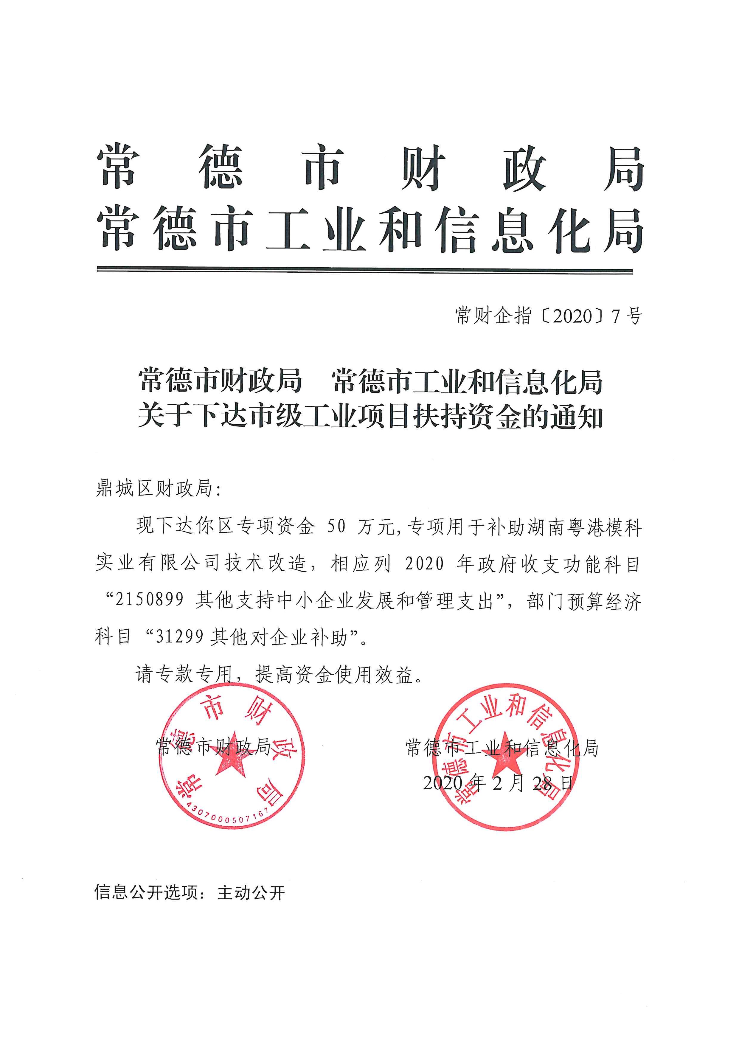 常德市财政局 常德市工业和信息化局关于下达市级工业项目扶持资金的通知