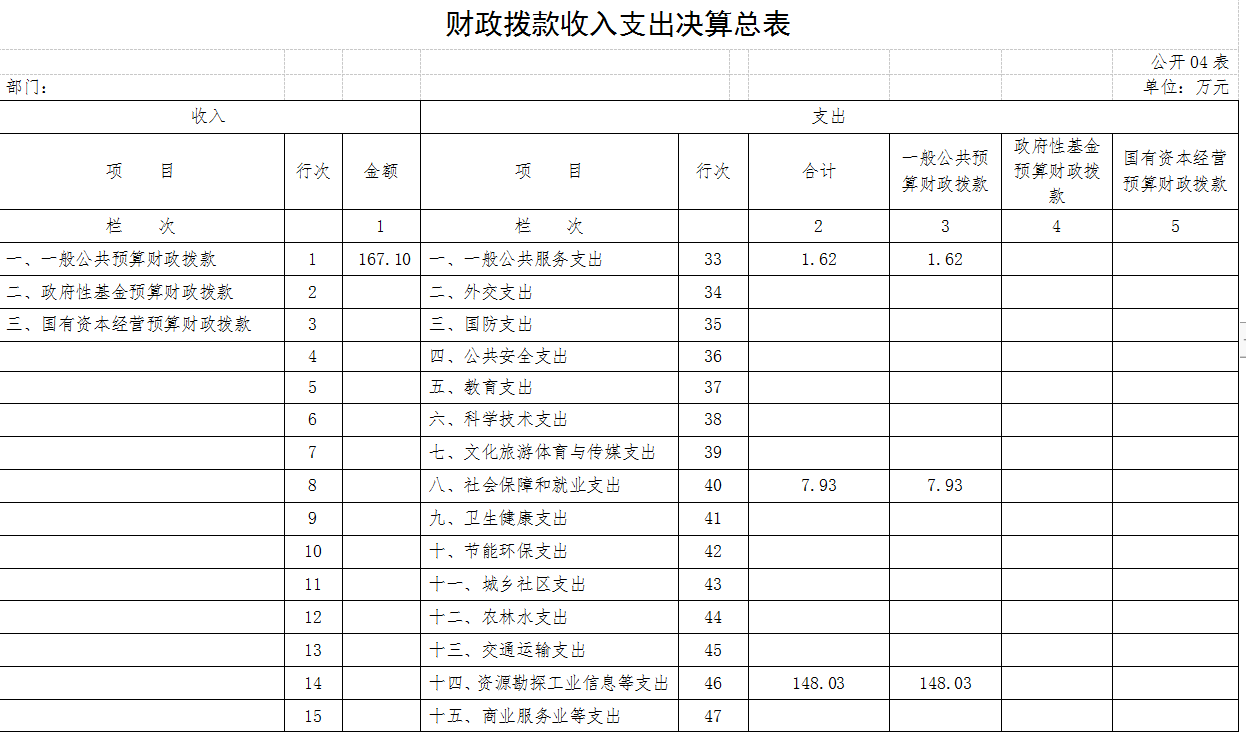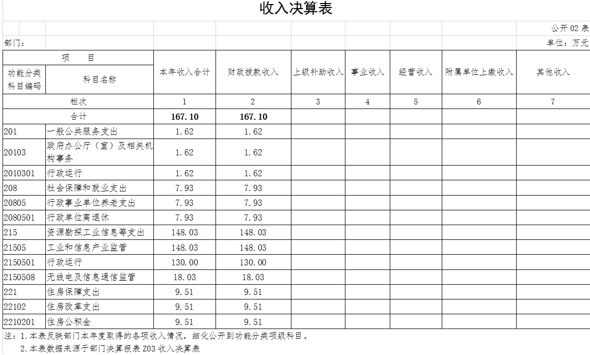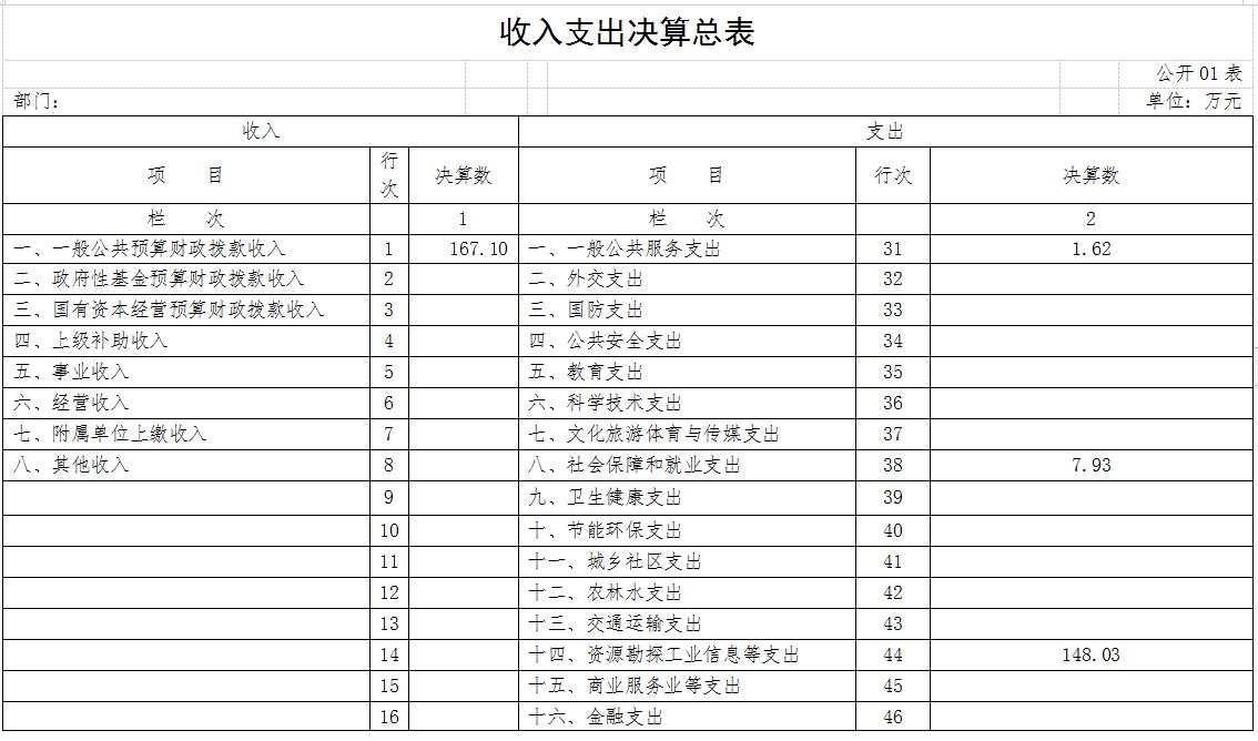 2021年度收入合计167.10万元,其中:财政拨款收入167.10万元,占100%;上级补助收入0万元,占0%;事业收入0万元,占0%;经营收入0万元,占0%;附属单位上缴收入0万元,占0%;其他收入0万元,占0%。