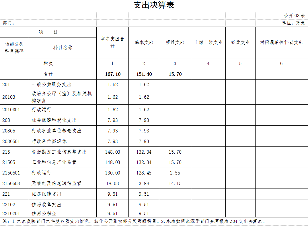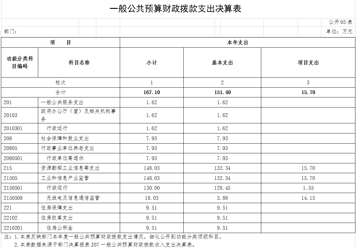 2021年度财政拨款支出167.01万元,主要用于以下方面:一般公共服务(类)支出1.62万元,占1%;社会保障和就业支出7.93万元,占5%;资源勘探工业信息等支出148.03万元,占89%;住房保障支出18.80万元,占5%。