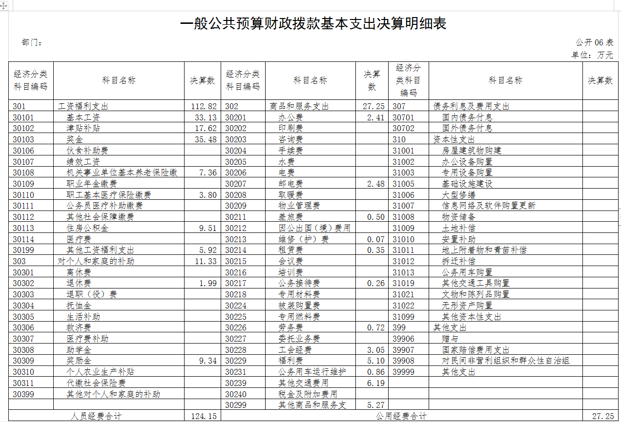 2021年度财政拨款基本支出151.40万元,其中:人员经费124.15万元,占基本支出的82%,主要包括基本工资、津贴补贴、奖金、机关事业单位养老保险缴费、职工基本医疗保险缴费、住房公积金、其他工资福利支出、退休费、奖励金;公用经费27.25万元,占基本支出的18%,主要包括办公费、邮电费、差旅费、维修(护)费、租赁费、工会经费、福利费、公务车运行维护费、其他交通费用以及其他商品和服务支出。