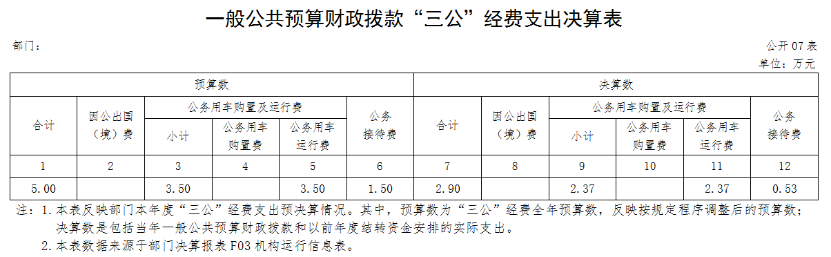 2021年度一般公共预算财政拨款“三公”经费支出决算中,公务接待费支出决算0.53万元,占18%,因公出国(境)费支出决算0万元,占0%,公务用车购置费及运行维护费支出决算2.37万元,占82%。其中: