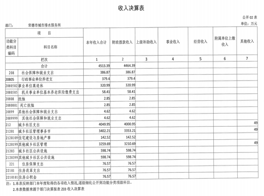 本年收入4513.39万元, 其中一般公共预算财政拨款为 4464.39 万元 ,其他资金49万元 。其中社会保障和就业支出 386.87 万元 , 占本年收入的 8.57 % ,城乡社区支出 4049.95 万元 , 占本年收入的 89.73 % ,住房保障支出 76.57 万元,占本年收入的 1.7 % 。