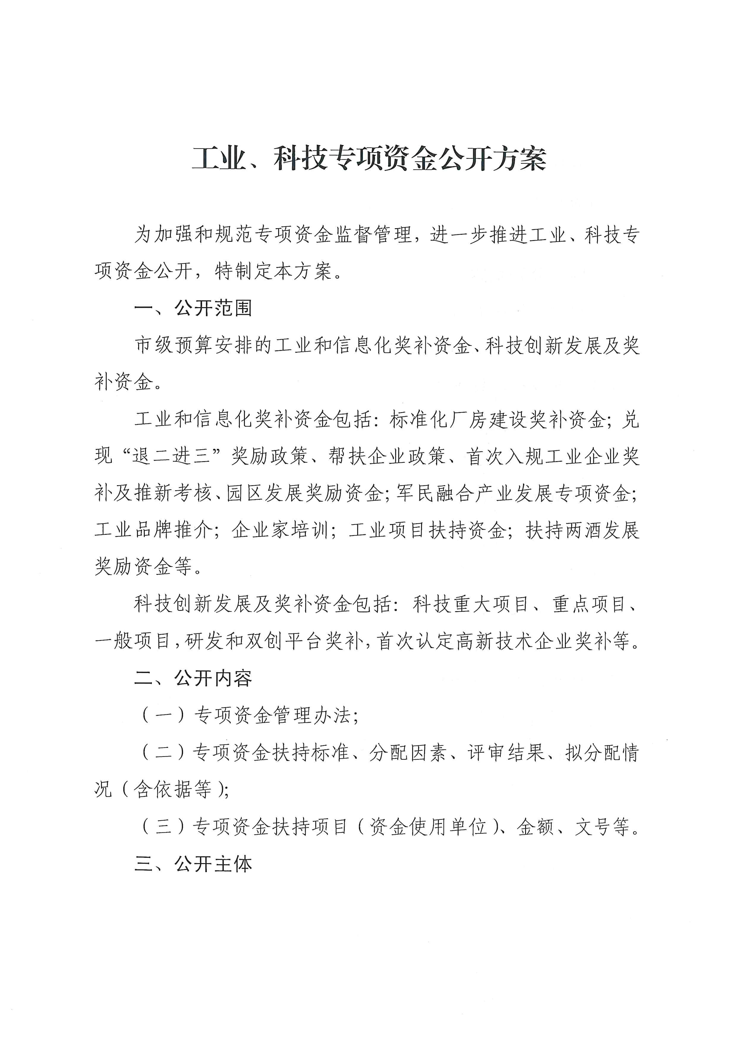 工业、科技专项资金公开方案