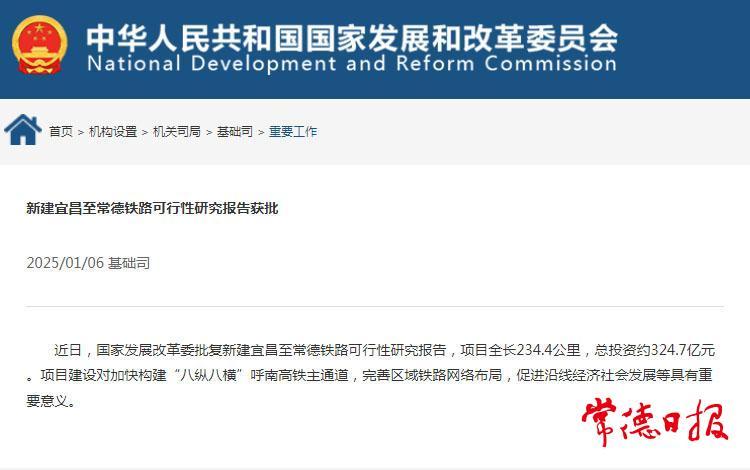 1月6日,记者从国家发展改革委官网获悉,国家发展改革委近日批复新建宜昌至常德铁路可行性研究报告。项目全长234.4公里,总投资约324.7亿元。